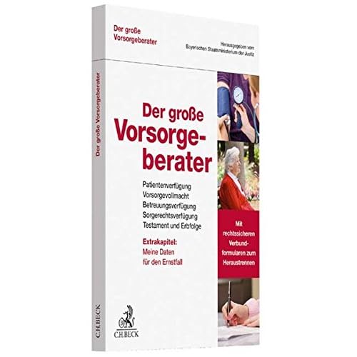Zum Werk Immer mehr Menschen können aufgrund von Altersdemenz, Unfall oder Krankheit nicht mehr für sich selbst sorgen. In Deutschland gibt es über 1 Mio. Betreuungen. Wenn die Betreuung durch einen vom Gericht eingesetzten Betreuer vermieden werden soll, muss jeder durch geeignete Verfügungen vorsorgen. Wie dies geht, erfährt man in diesem Werk. Der große Vorsorgeberater enthält Formulare für die Patientenverfügung, die Vorsorgevollmacht und die Betreuungsverfügung. Die Herausgeberschaft durch das bayerische Staatsministerium garantiert absolute Rechtssicherheit. Er erläutert anschaulich, warum es so wichtig ist für jedermann, sich mit dem Thema Vorsorge zu beschäftigen. Eltern minderjähriger Kinder finden außerdem ein Formular für eine Sorgerechtsverfügung. Damit können sie für ihren Todesfall einen Vormund für ihre Kinder bestimmen. Zahlreiche Beispiele für Testamente zeigen, welche Regelungen möglich sind und damit den Familienfrieden sichern. Ergänzt werden Formulare zum Ausfüllen und Heraustrennen durch praxisnahe Erläuterungen und Beispiele. Damit Angehörige im Notfall sofort Kontakt zu Hausarzt, Banken, Versicherungen, Vermieter und anderen wichtigen Ansprechpartner erhalten, findet sich ein umfangreicher Notfall-Formularteil am Ende des Vorsorgeberaters. Vorteile auf einen Blick - verständlich - umfassend - kompetent - Formulare zum Ausfüllen und Heraustrennen Zielgruppe Jeder über 18 Jahre, der für den Notfall vorsorgen und insbesondere seinen Angehörigen wichtige Entscheidungen erleichtern möchte.Taschenbuch=144 Seiten. Verlag=C.H.Beck; Auflage: 1 (28. Dezember 2016). Sprache=Deutsch. ISBN-10=3406698344. ISBN-13=978-3406698347. Größe und/oder Gewicht=21,2 x 1,4 x 30,3 cm. Durchschnittliche Kundenbewertung=5.0 von 5 Sternen 5 Kundenrezensionen. Amazon Bestseller-RangRechtsratgeber=Nr. 233.980 in Bücher (Siehe Top 100 in Bücher) .zg_hrsr { margin: 0; padding: 0; list-style-type: none; } .zg_hrsr_item { margin: 0 0 0 10px; } .zg_hrsr_rank { display: inline-block; width: 80px; text-align: right; } Nr. 522 in Bücher > Ratgeber >.